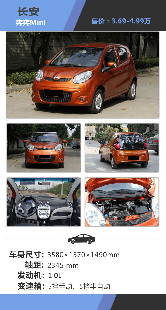 在车厢内部,奔奔Mini也是诚意满满,中控部分采用了黑白的双色设计,出风口,按钮操作区均用白色的材料进行了点缀,有着足够的玩味。夸张一点说,一点都不比奔驰的Smart逊色。另外,得益于车顶平直的线条,即使是身高一米八的大高个,在前后排也能够得到1拳的头部空间,相当的理想。更对前排座椅的后方进行了适当的偷空处理,使得后排的乘客能够获得宽裕的腿部活动空间。动力方面提供1.0L的自然吸气发动机,变速箱有5MT以及5AMT可选。和比亚迪F0一样,首选5MT版本车型。