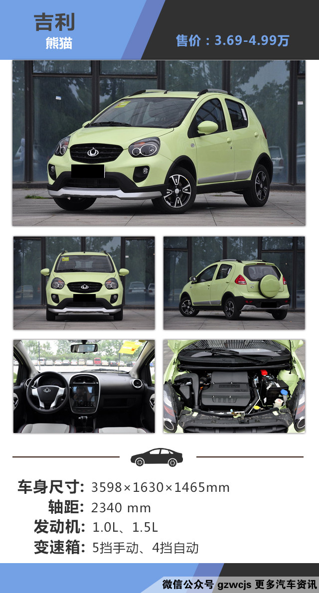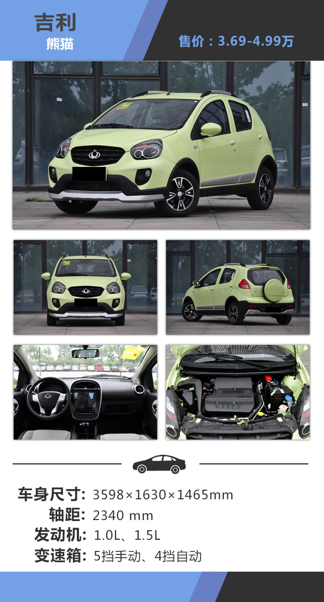 吉利熊猫是教授极力推荐的一款车型,不仅因为其4万不到的售价,更因为其外形的设计有着很高的设计感,要知道这可是纯自主的设计,百分百原创。整车采用了仿生学的设计,更名字一样,两颗硕大的头灯占据了前脸不少的位置,同时采用了黑色的饰条进行包边,构成了一双熊猫的大眼,有着很不错的趣味感。整车的线条均以圆润为主,车头到车顶,再到尾部,线条的过渡自然和谐。而尾部则采用了双色的搭配设计,上方为黑色部分的车窗,下方为车身颜色,时尚感爆棚。至于尾灯,则用了跟前大灯相同的造型,大灯内部也采用了精致的双色设计,即使日间也有着不错的视觉感官。