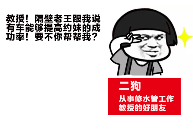 教授的好朋友二狗,总是向教授吐槽,说现在没个车都不好意思跟妹纸搭讪,上班遇着下雨,还得湿漉漉的回办公室,一番慨叹没车之苦。可买车吧,就那个小飞度也得8万多,对于从事修水管工作的二狗而言,月薪5000元的工资实在是难以支撑起这笔费用。当然,二狗也算没白认识教授,本着以最少条件当上有车一族的原则,教授给他推荐了几款3万多即有交易的小车。能代步、能挡雨,恩~看起来还相当不错!