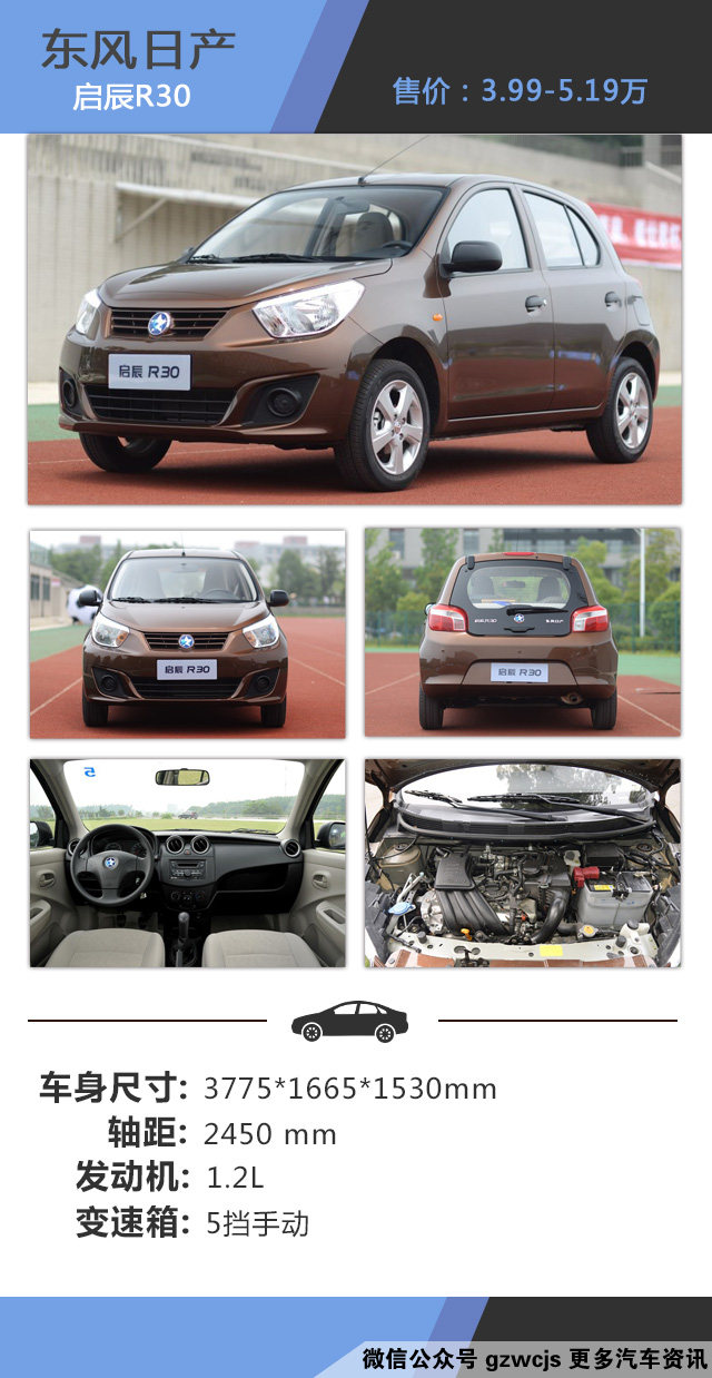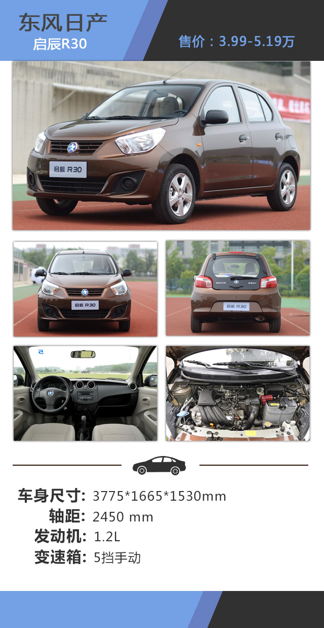 启辰R30从外观上就能看出日产玛驰的影子,经过启辰品牌的整合,R30的价格已经下探到玛驰去不到的位置,和奥拓等车型相差无几的区间。启辰R30的定位就是针对年轻人的,因此价格也是它的竞争力所在。外观方面和原型车玛驰走得路线稍有不同,玛驰造型偏向圆润可爱,启辰R30的线条则偏硬朗,多了些阳刚气息。