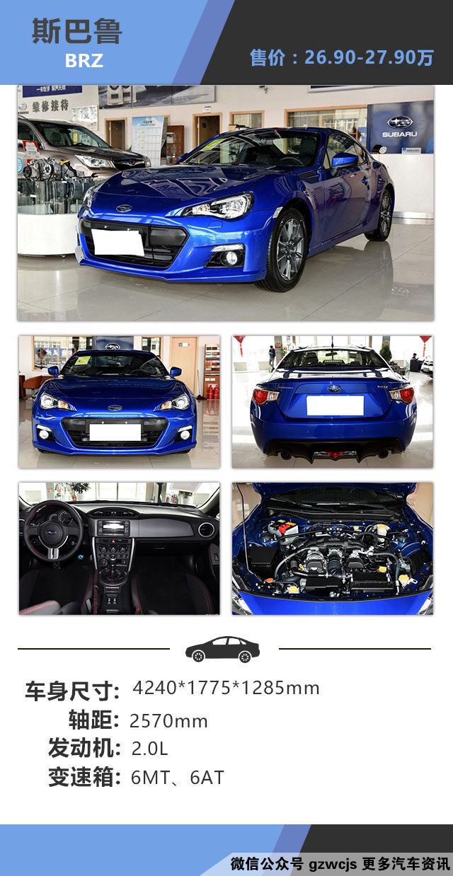 动力方面采用罕见的水平对置-2.0L自然吸气发动机,传动方面分别使用6MT和6AT两种变速箱,在操控上提供了不同的驾驶乐趣,在百公里加速时间上可分别实现7.6秒和8.2秒。同时具备精准的转向和高超的底盘调校,因此BRZ的弯道的通过性和可玩性大大优胜于其余车型。