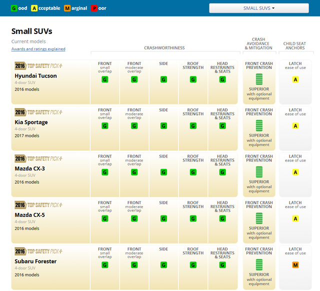 IIHS的测试项目包括防撞性能(25%正面偏置碰撞、40%正面偏置碰撞、侧面碰撞、车顶强度、头枕/座椅共五项)、前部预防碰撞系统性能、儿童安全座椅锚点与安装。