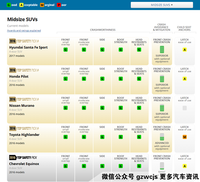 中型SUV的表现要逊色不少,只有四款车型获得TSP+评价,并且前部预防碰撞系统和儿童安全座椅两方面的整体表现不如小型/紧凑型SUV。