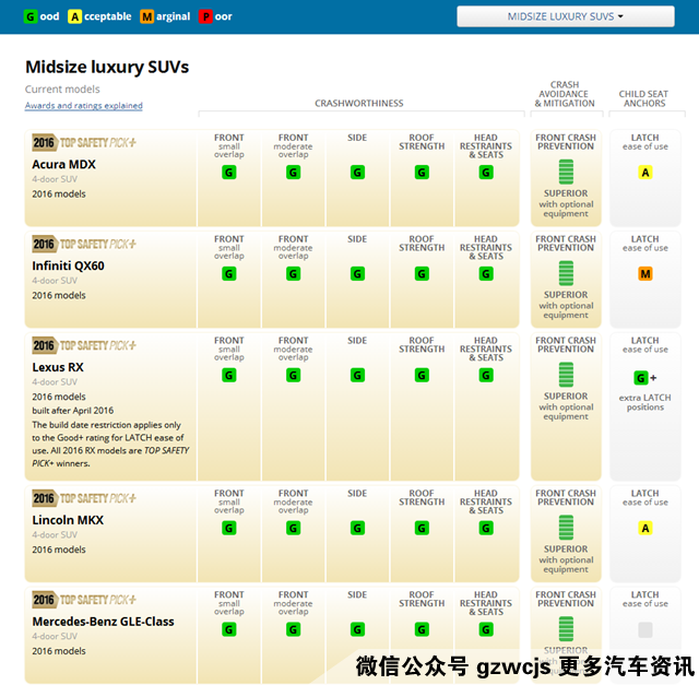 中型豪华SUV的表现相当不错,很多车型获得TSP+评价,最安全SUV就在这个组别,它就是雷克萨斯 RX,防撞性能全“优”评价,前部预防碰撞系统表现出色,儿童安全座椅方面更是获得“优+”评价。