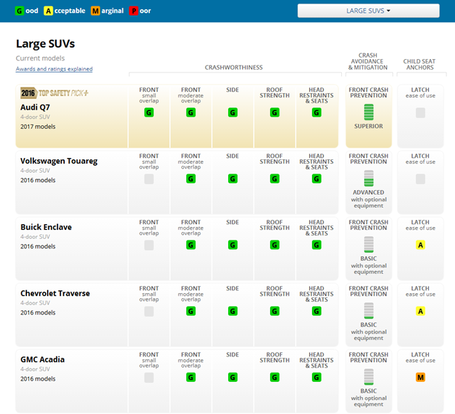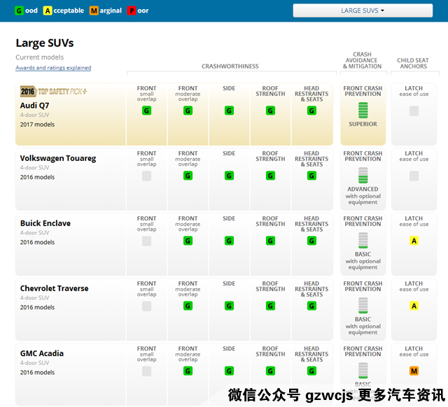 大型SUV级别,由于其它车型做碰撞测试时还没加入25%正面偏置碰撞这个项目,所以只有奥迪Q7获得了TSP+评价。