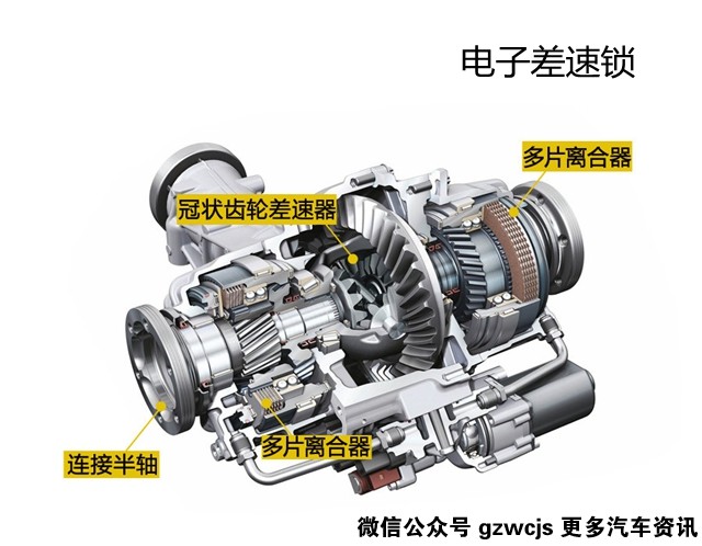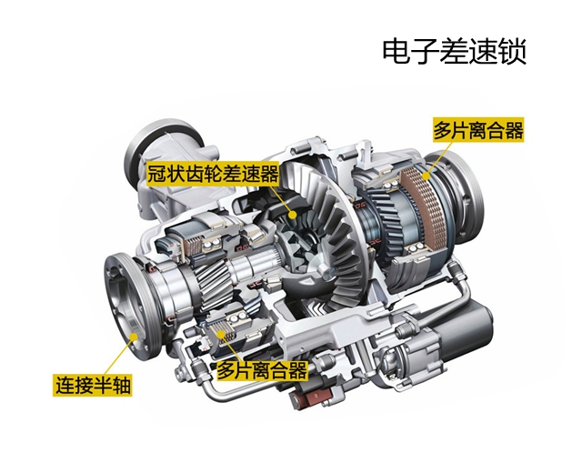 电子差速锁是ESP的一种扩展功能,在普通开放式差速器的基础上加装多片离合器作为扭矩的分配,通过ESP的传感器自动探测到两驱动轮的转动速度,从而判断车轮是否失去附着力,对打滑一侧的车轮进行制动,有附着力的轮胎就会提高动力输出,减少车轮打滑白白浪费动力。系统对打滑车轮的制动力施加直接影响到了电子差速锁的效率,某些高效的电子差速锁能够跟差速锁相当的效果。