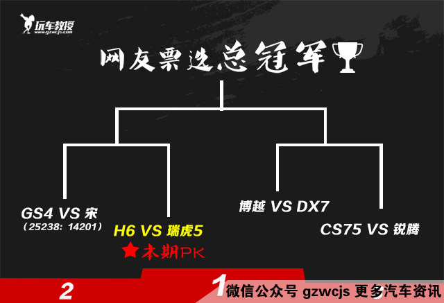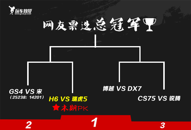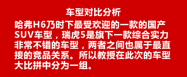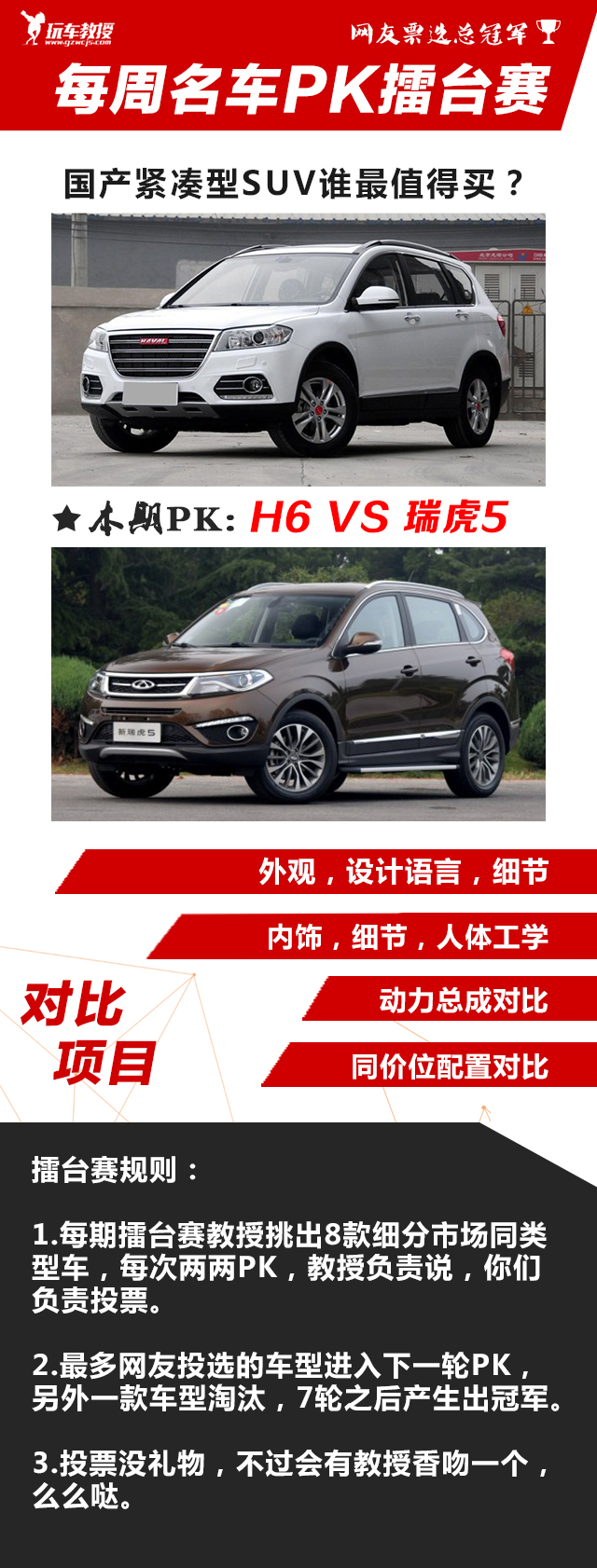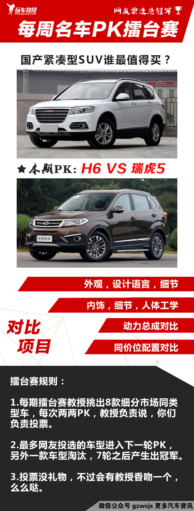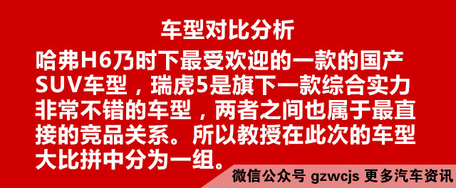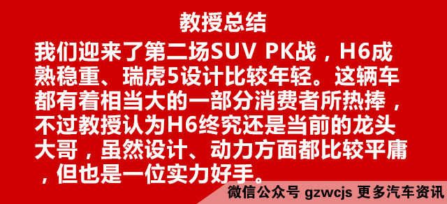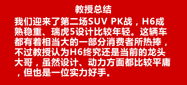 各位观众大家好,经过了第一轮的国产SUV大比拼,传祺GS4以压倒性的优势战胜了比亚迪宋,其实这也是教授可预料的,毕竟GS4更为大众化也让更多的消费者所接受,而在本次的PK大比拼中,教授更是请来了最受消费者所关注的国产SUV中的龙头大哥H6以及圈中的新贵瑞虎5,废话不多说,我们赶紧来看看接下来的比拼。