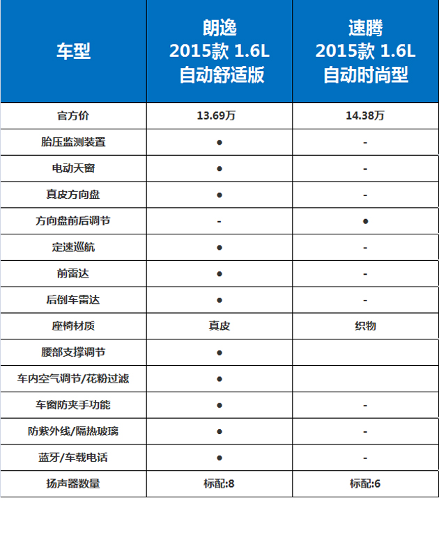 作为大众最屌的两辆车--朗逸、速腾,前者长期占据轿车销量榜榜首,5月以36,047辆销量的绝对性优势压倒其余竞争对手,这朗逸毫不夸张的说,就是一个神话。而后者在断X门引起的强烈舆论漩涡中,销量依然一路长虹。在5月份,更以27,988辆的销量稳居销量榜第6名的位置。在大众品牌犀利的号召力下,这两款车型都成为了不少轿车消费者的选择目标。对于非大众不买的消费者而言,在价格相差无几的情况下,选择谁更为合适呢?