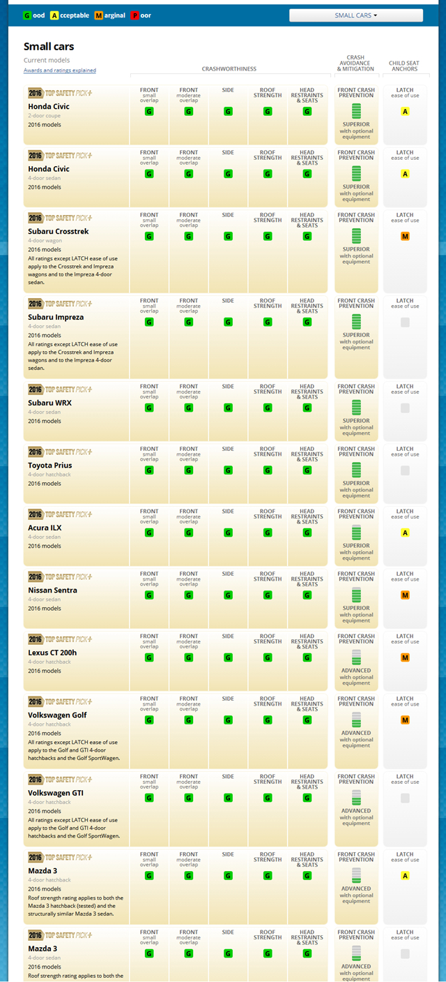 看到这里估计很多人都在说教授怎么不提提日本车的安全性能,日本车往往都被说成铁皮薄、防撞钢梁用料不厚道等等之类的,总之就是说日本车不安全。我们来看看美国IIHS的碰撞测试,在SMALL CARS(小型汽车)的分类中可以看到获得TOP SAFETY PICK+(优+)评价的车型,绝大多数都是日本车,在这里并不是要说明日本车安全性很好,而是要说明日本车就是不安全的这个观念是错误的,一辆车的铁皮厚度、重量的轻重这些对车辆的安全性能影响甚微。