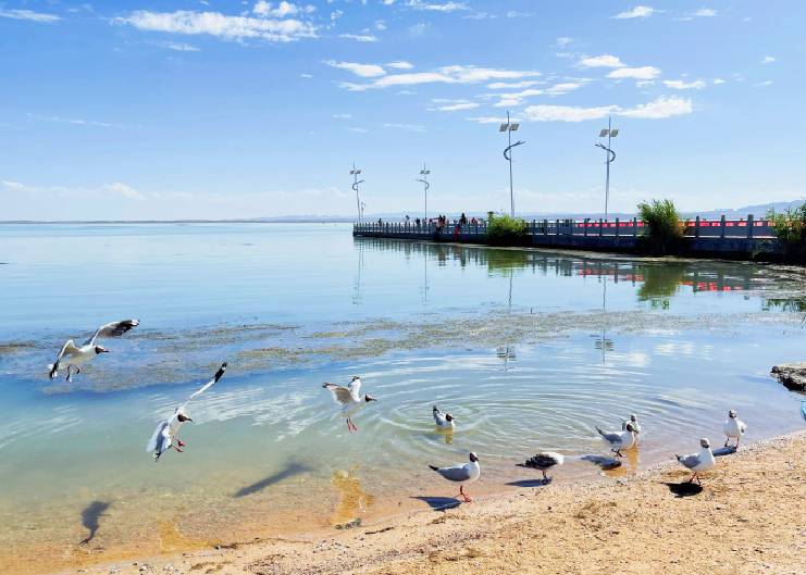 从茶卡出来,经过大片荒芜的黄土高原,漫天遍野干枯的黄色,让人感到灼热而窒息。走出高原,迎来一片片戈壁,除了一团团绿色的骆驼刺还有星星点点紫色的马兰花,生机盎然。 傍晚时分终于到了翡翠湖,小火车已经停止运营了,意外地发现还有沙地摩托可以骑,两个没有看过小红花的人成功地进去打了个卡。出来恰好看到落日,映在清盈盈的湖水中,美极了。