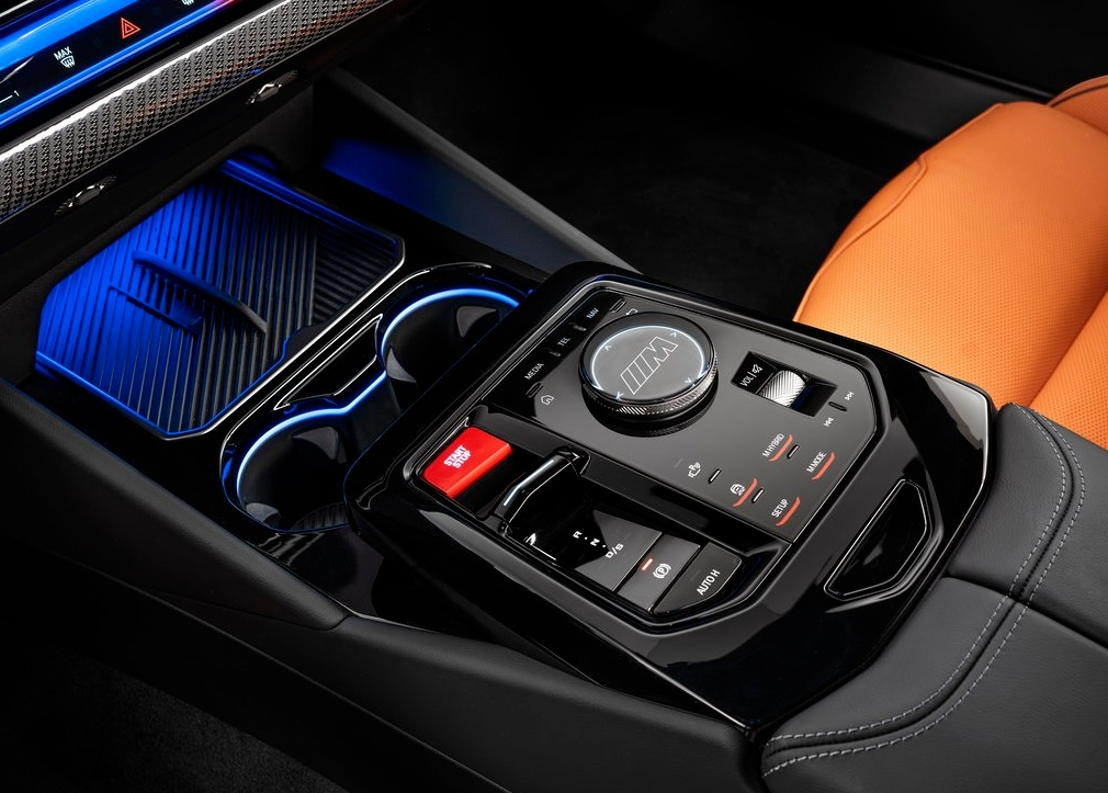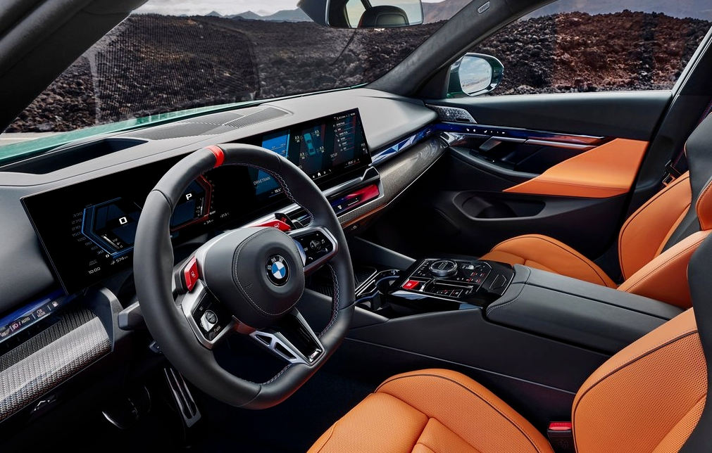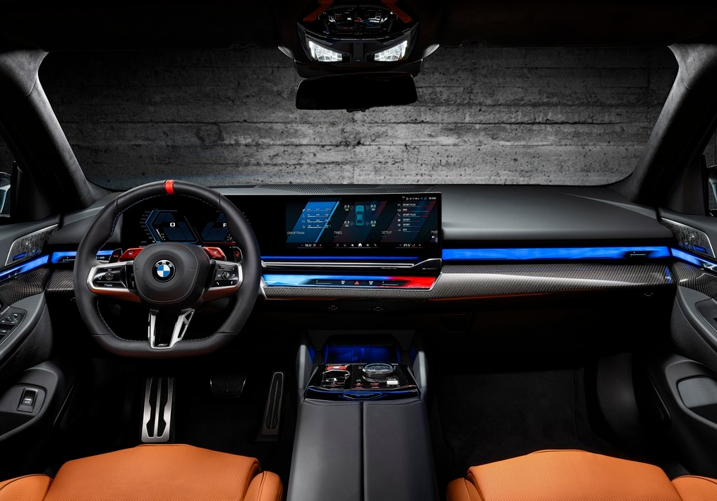 内饰部分,全新宝马M5拥有专属真皮内饰,仪表盘与中控屏尺寸分别为12.3与14.9英寸,氛围灯主色为蓝红“宝马色”,座舱氛围运动豪华科技感满满。