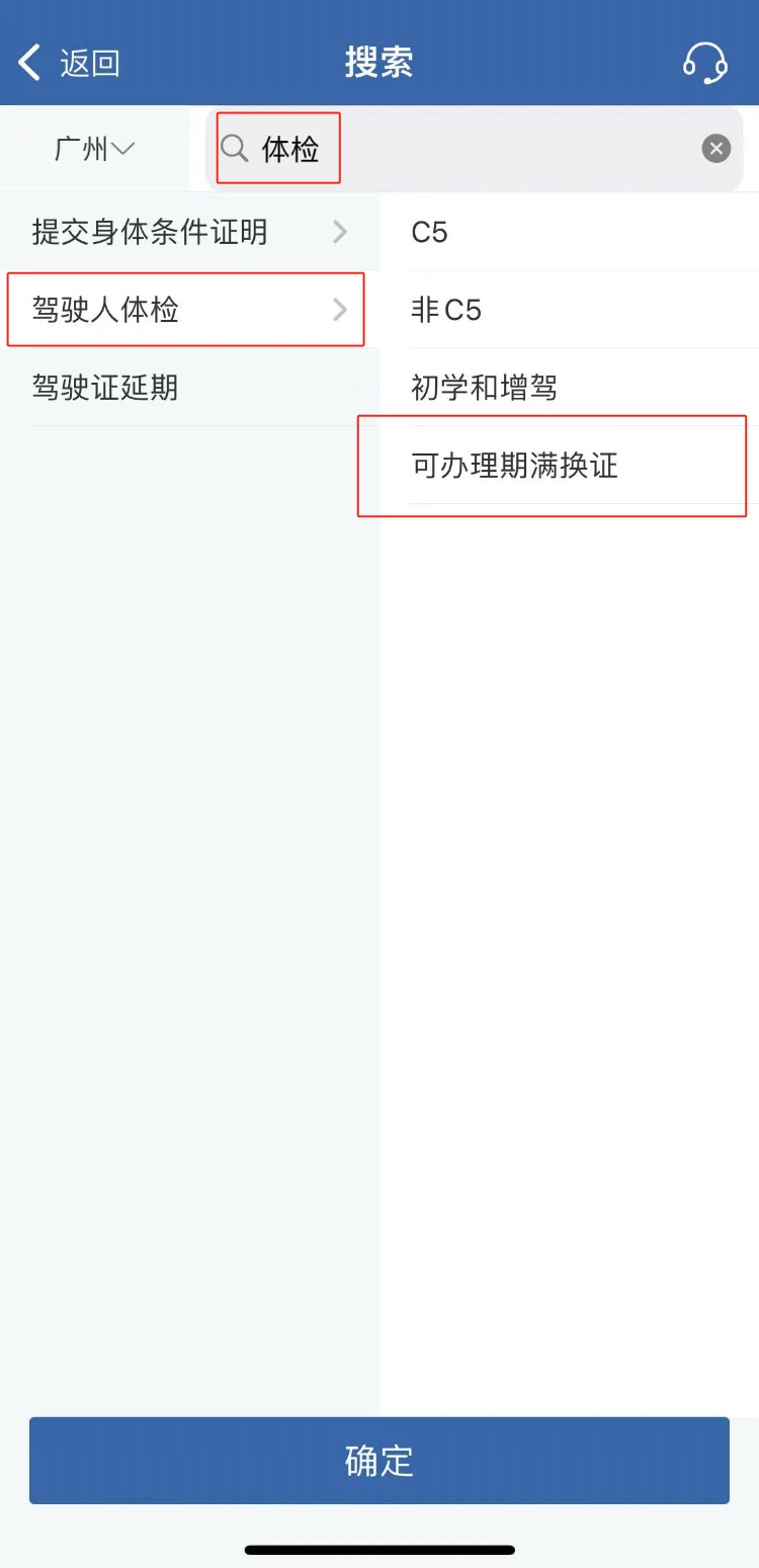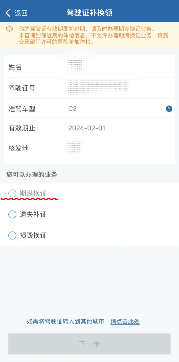(如““期满换证”灰色不能点击”,需要返回首页,搜索体检,选择离自己比较近的驾驶证体检点进行体检,体检后即可选择)