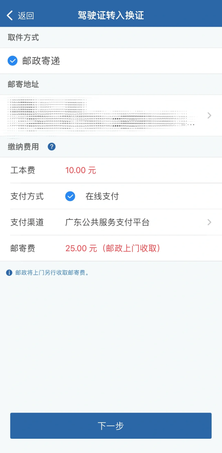 5.选择取件方式。可以选择自取或邮寄方式领取新驾驶证。如果选择邮寄,填写收件地址;如果选择自取,则选择自取网点。