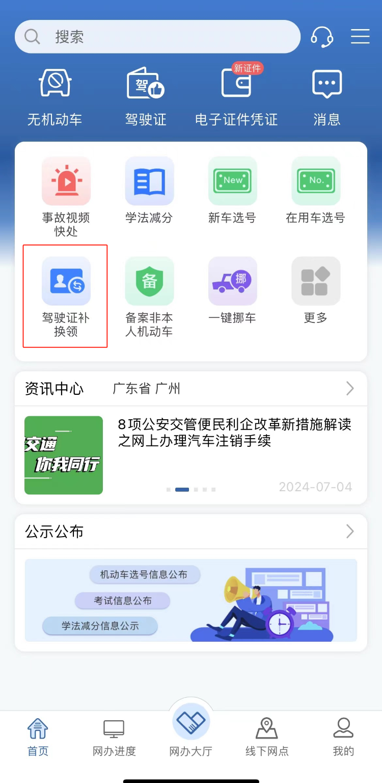 2.进入“业务中心”。有两种方式可以进入业务中心:通过首页的“更多”按钮,或者直接选择“驾驶证业务”中的“驾驶证补换领”。