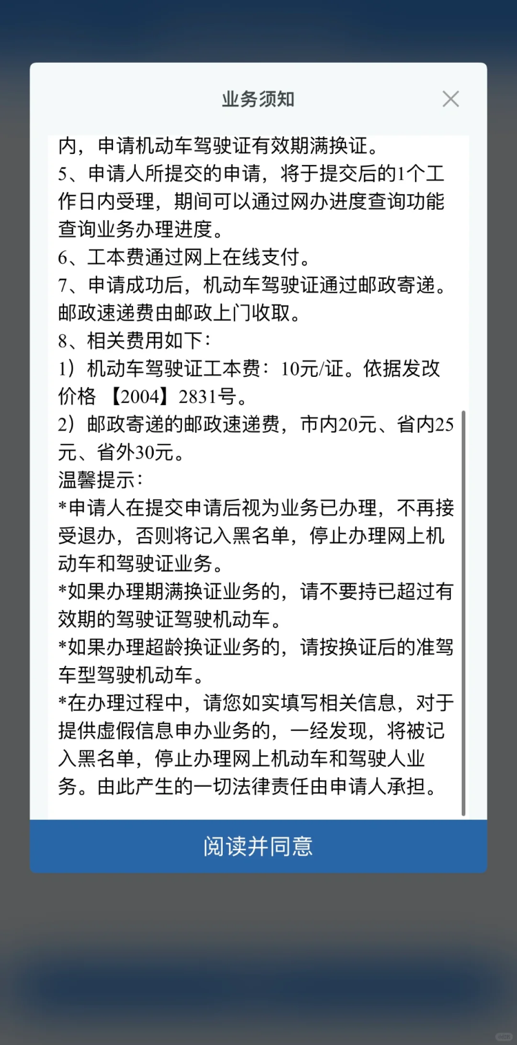 请注意,一旦在互联网提交驾驶证补换领业务申请,不再受理该业务退办。如果用户拒绝签收或者超过一个月未到指定网点取证,系统将自动把用户加入互联网黑名单,用户将不允许办理网上机动车和驾驶证相关业务。