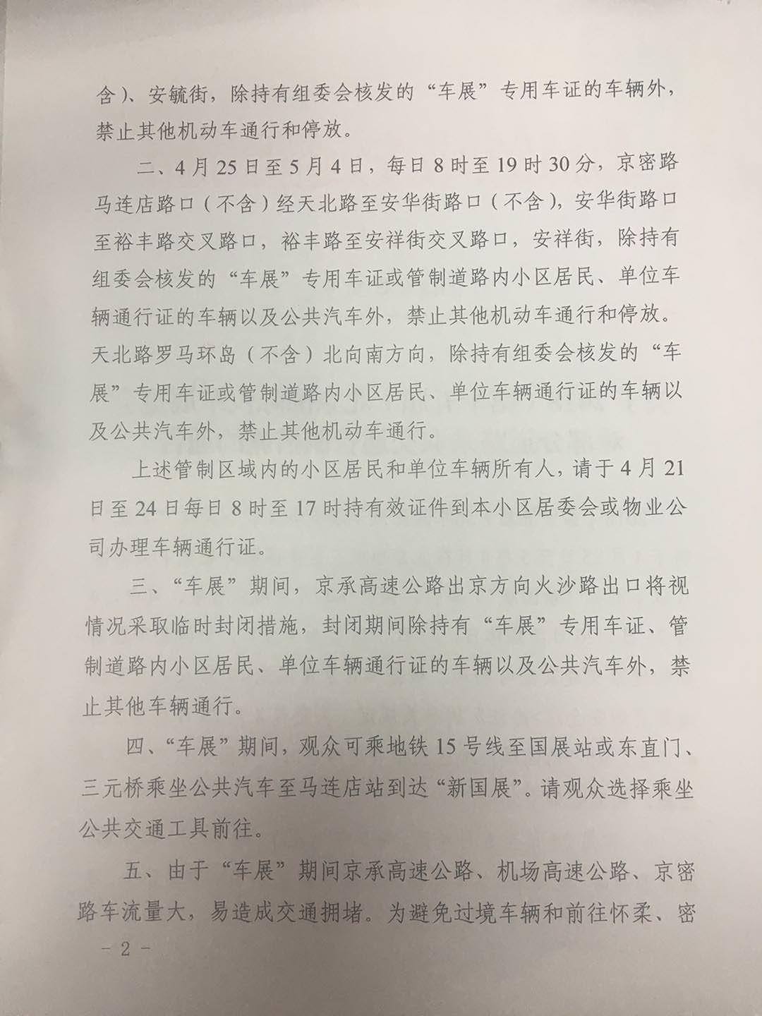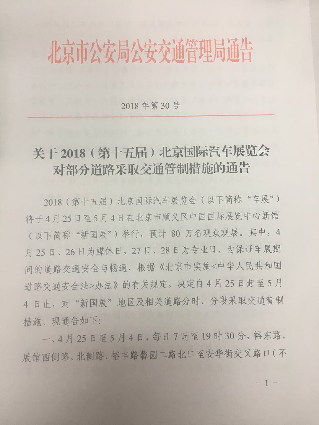 关于2018(第十五届)北京国际汽车展览会 对部分道路采取交通管制措施的通告